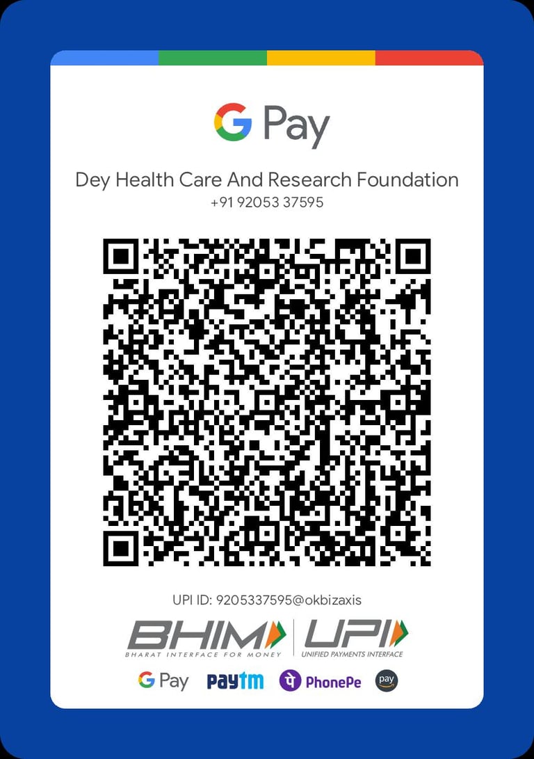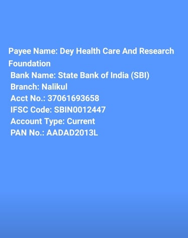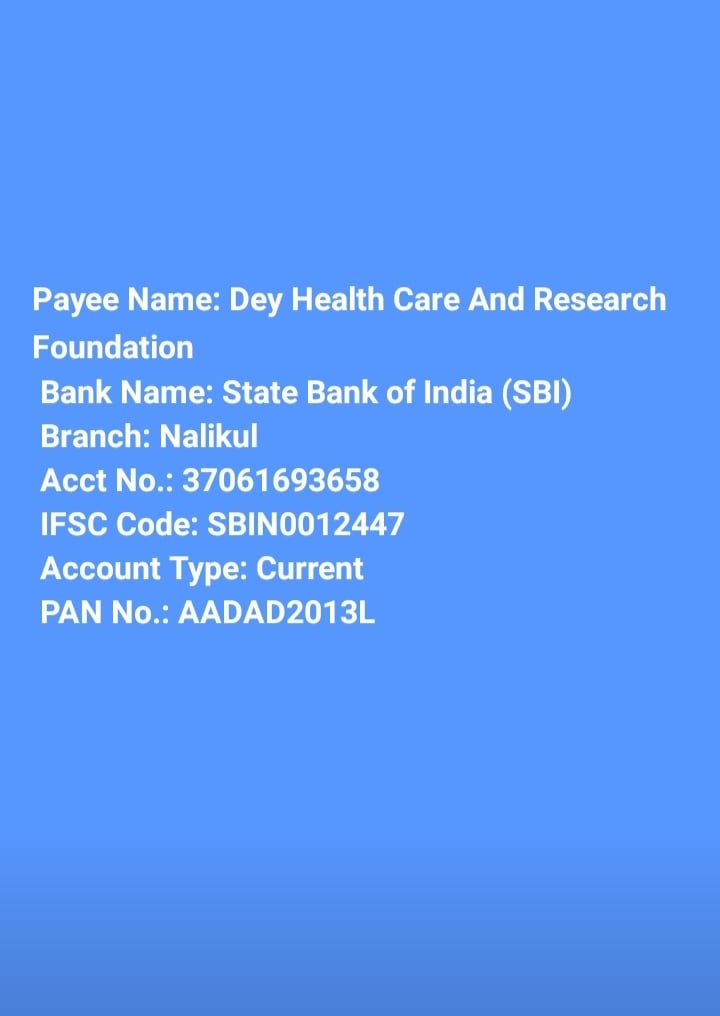 The donation may be deposited online in the following Account: Dey Health Care And Research Foundation, Account No. 37061693658, IFSC Code: SBIN0012447, Bank Name: State Bank of India (SBI), Branch: Nalikul, Account Type: Current, PAN No. AADAD2013L.